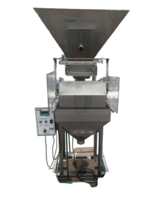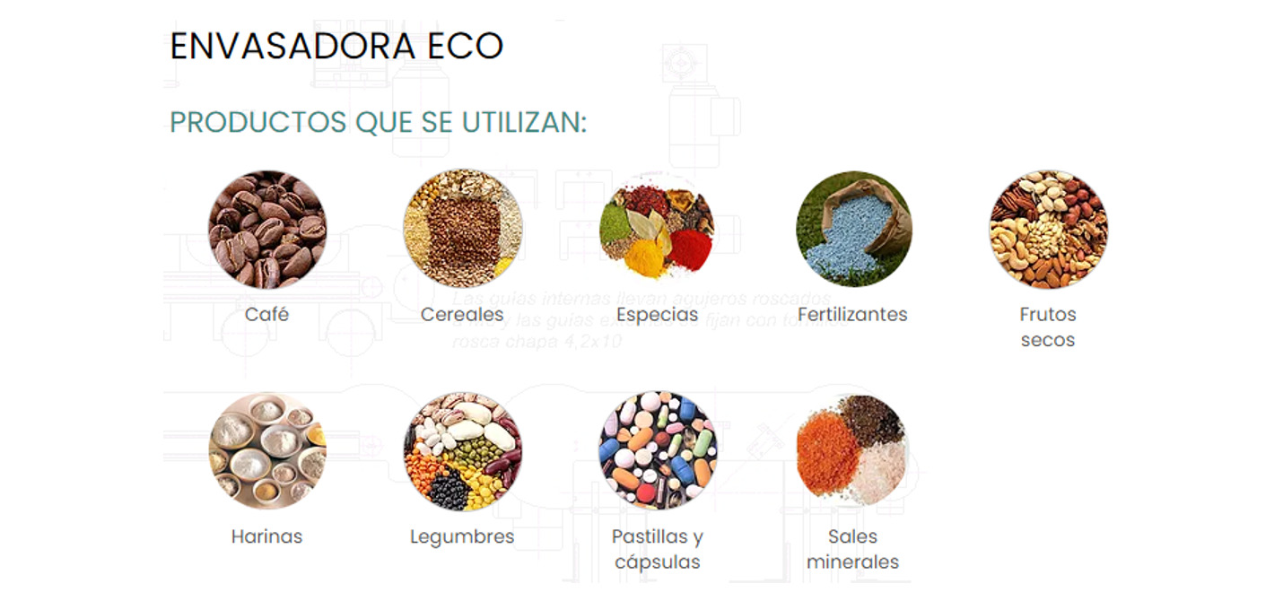 Envasadora Vertical SemiautomáticaLa envasadora ECO es una envasadora semiautomática que trabaja preparando dosis mediante pesaje de manera directa. El producto se deposita progresivamente en el envase hasta completar la dosis deseada. Esta máquina pesa directamente lo que hay dentro del envase.Funcionamiento:Un operario dispuesto frente a la máquina coloca el envase (bolsa, bote o caja) y pulsa un pedal. La máquina comienza la descarga de producto hasta alcanzar la dosis deseada, momento en el que se para. La máquina envasadora ECO no deja de descargar producto hasta que no se alcanza el peso de la dosis deseada. Dispone de una tolva para alojar el producto a envasar con una capacidad de 110 litros, y puede preparar dosis desde unos 15 gramos hasta 10 Kilos (dependiendo de las características del producto). La producción media está en torno a 8 o 16 dosis por minuto cuando se envasan botes o cajas, y entre 3 y 6 dosis por minuto cuando se envasan bolsas (dependiendo de las características del producto, del peso requerido, y de la destreza del operario). La envasadora ECO está concebida para trabajar especialmente con productos en polvo, granulados y hojitas, tales como especias, abonos, fertilizantes, productos fitosanitarios, aditivos para alimentación, entre otros. En Envasadoras Panimec disponemos de equipos sencillos de aspiración adaptables cuando se trabaja con productos que producen polvo al entrar en el envase.Características: Indicada para polvo y granulado Envase directo en bolsa o bote Pesada entre 10gr – 10kg Precisión 1gr Regulación de la altura de la báscula por husillo Alta producción Fácil manejo Dispositivo para sujección de bolsas de serie Posibilidad de adaptar un aspirador para trabajos con polvos muy volátiles Fabricada en acero inoxidable según normativa CE